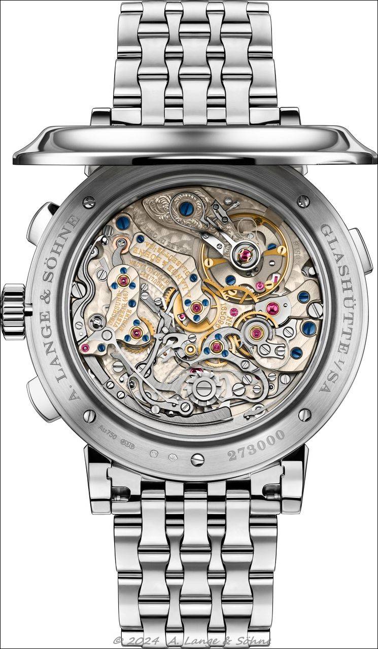 Hinter dem gravierten Klappboden kommt das aus 451 Teilen gefertigte, zweifach montierte und aufwendig vollendete Handaufzugskaliber L951.6 zum Vorschein. Der Saphirglasboden erlaubt Einblicke in die präzisen Schaltvorgänge, wie zum Beispiel die des Minutenzähler-Mechanismus und des Kolonnenrads. Zudem werden der hohe Finissierungsgrad und die sorgsame Komposition ästhetischer Details, die mit der technischen Komplexität einhergehen, in voller Schönheit sichtbar. Weitere Elemente dieses feinmechanischen Kunstwerks sind die Brücken aus naturbelassenem Neusilber, der handgravierte Unruhkloben mit Schwanenhals-Feinregulierung und vier verschraubte Goldchatons.